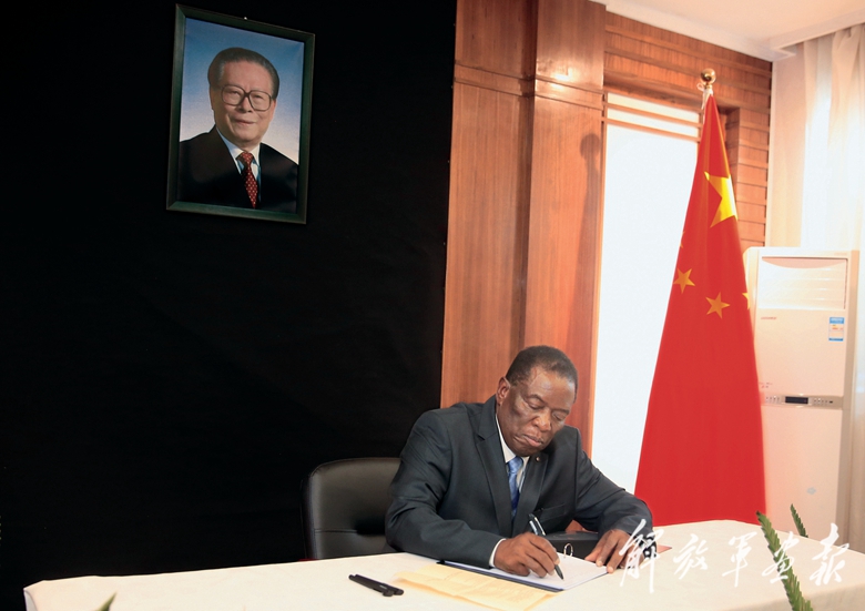 12月5日,津巴布韦总统姆南加古瓦在中国驻津巴布韦大使馆吊唁江泽民同志。(摄影/肖恩·朱萨)