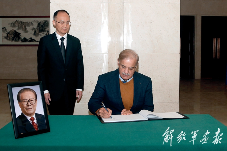 12月1日,巴基斯坦总理夏巴兹在中国驻巴基斯坦大使馆吊唁江泽民同志。(摄影/艾哈迈德·卡迈勒)