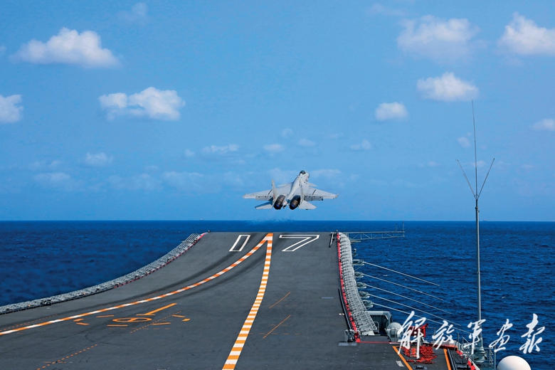 2023年4月,东部战区开展环台岛战备警巡和“联合利剑”演习。图为歼-15舰载机从海军山东舰起飞升空。(摄影/安 妮)