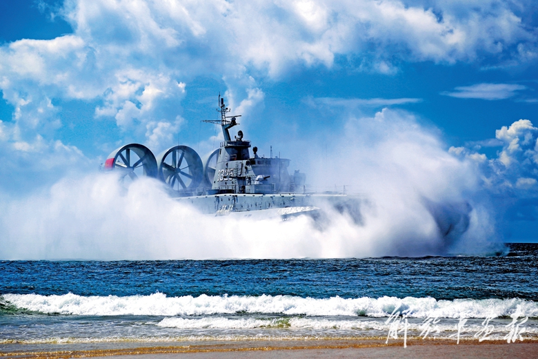 2015年8月,某型气垫登陆艇在远距离奔袭登陆演练中破浪抢滩。(摄影/黎友陶)
