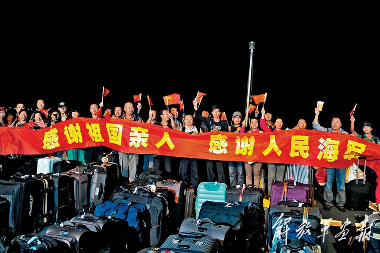 2015年3月底,针对也门局势急剧恶化,在亚丁湾、索马里海域执行护航任务的中国海军第19批护航舰艇编队紧急赶赴也门执行撤离中国公民任务。图为同胞打出横幅,向海军官兵表示感谢。(摄影/熊利兵)
