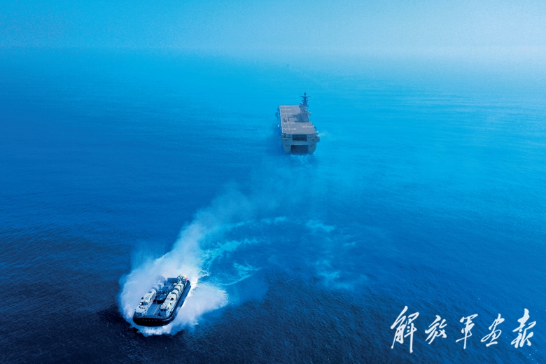气垫艇搭载两栖战车驶出海南舰坞舱。(摄影/殷 征)