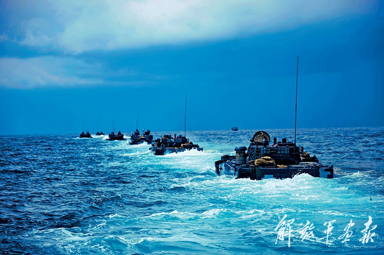 海军陆战队某旅组织两栖装甲装备海上泛水编波训练。(摄影/尚文斌)