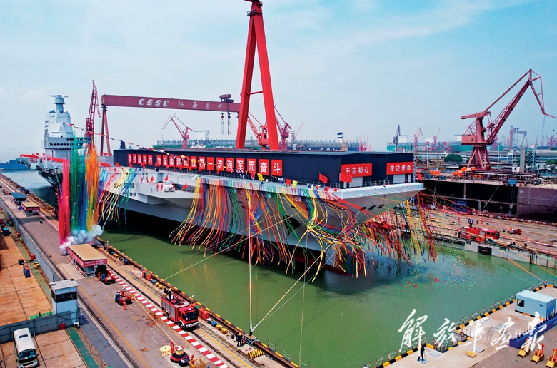 2022年6月17日上午,我国第三艘航空母舰福建舰下水命名仪式在中国船舶集团有限公司江南造船厂举行。(摄影/新华社记者 李 刚)