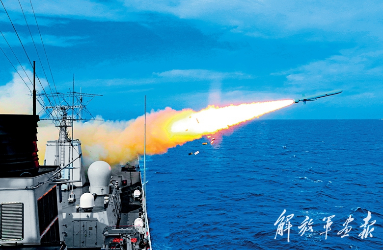 2016年8月1日, 海军三大舰队在东海开展大规模实兵实弹对抗演习。图为郑州舰发射反舰导弹。(摄影/记者 李三红)