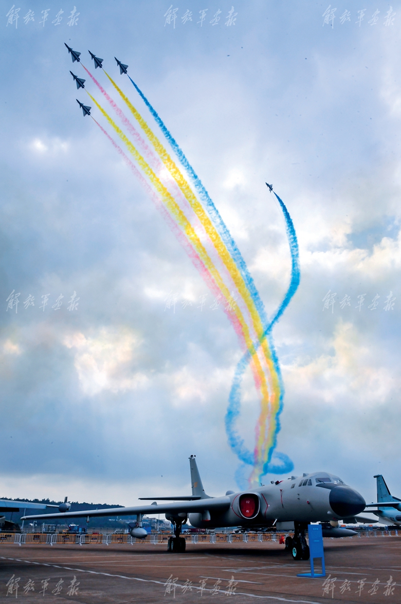空军航空大学“红鹰”飞行表演队飞越航展现场上空。