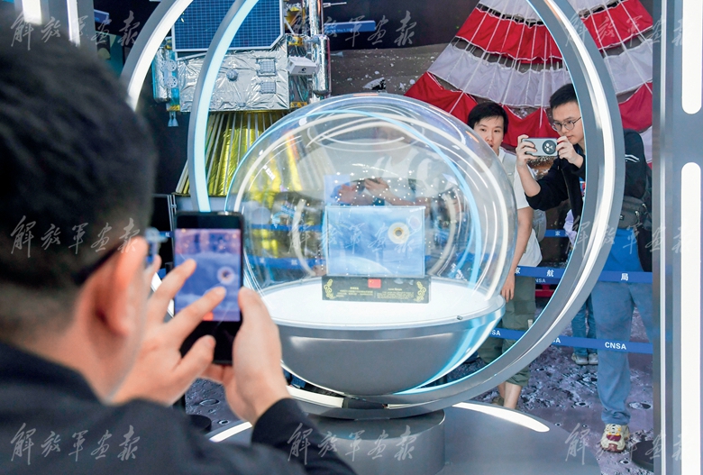 嫦娥六号任务取回的月球背面月壤样品首次在“中国航天”展台向国内公众展出。