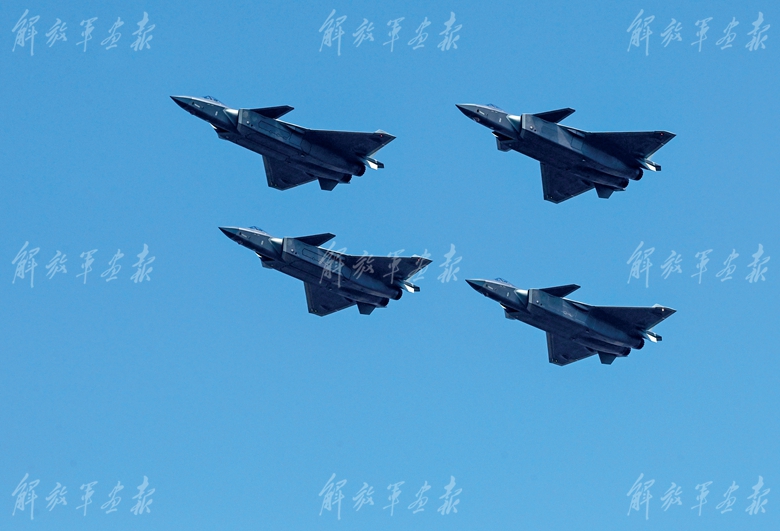 空军歼-20战机四机编队飞行展示。