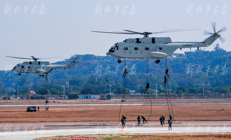 海军陆战队进行空降突击课目展示。