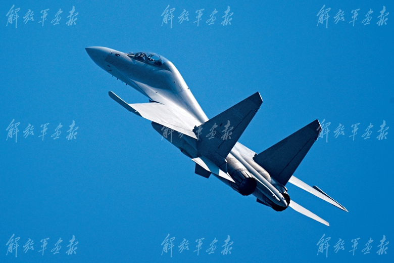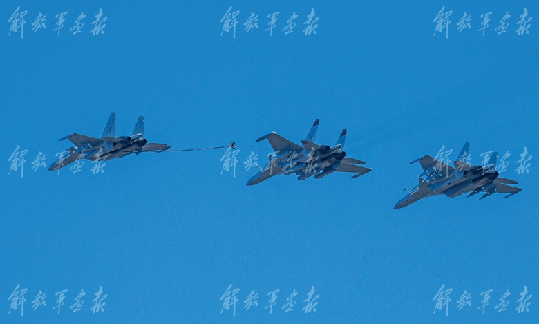 海军歼-15系列舰载战斗机编队展示伙伴加油课目。