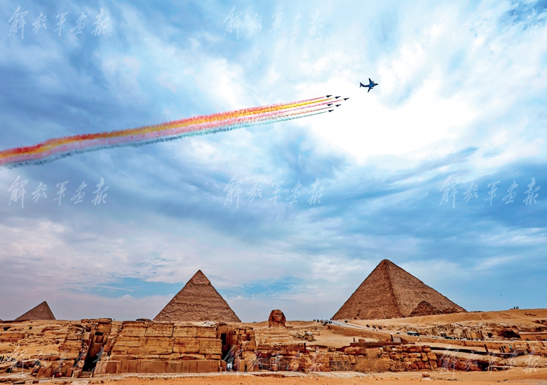 中午时分,受邀参加首届埃及航展的人民空军运-20与歼-10表演机编队呼啸而来,飞越金字塔上空,拉出象征中埃两国国旗颜色的6道彩烟,与金字塔历史性“同框”。