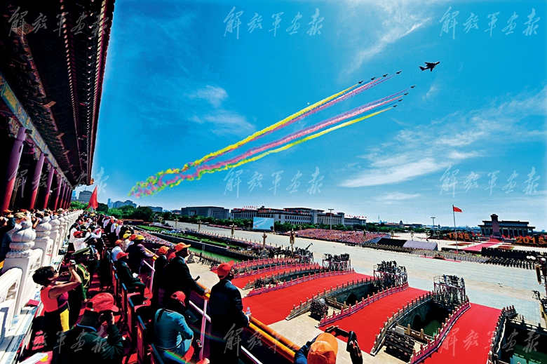 2015年9月3日,庆祝中国人民抗日战争暨世界反法西斯战争胜利70周年阅兵现场,空军八一飞行表演队飞过天安门广场上空,接受检阅。(摄影/王卫东)