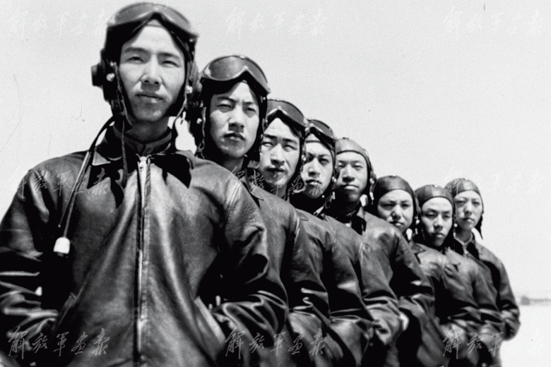 在抗美援朝战场上,王海率领年轻的飞行大队,靠着敢于空中拼刺刀的血性,立下赫赫战功。图为当年“英雄的王海大队”官兵留影。