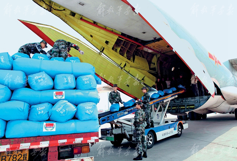 2015年4月,空军航空兵某部飞行三大队运送救灾物资及人员飞赴发生强烈地震的尼泊尔,展开人道主义救援。(摄影/周建华)