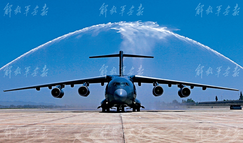 2016年7月6日,空军隆重举行运-20飞机授装接装仪式。图为交付的首架运-20飞机滑过“水门”。(摄影/刘 畅)