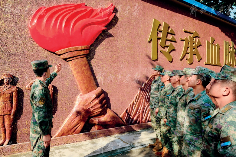 空军某场站官兵在部队先烈墙前,开展“新时代奋斗观”大讨论活动,讲述部队战斗历程,激发官兵奋斗热情。(摄影/陈豪豪)