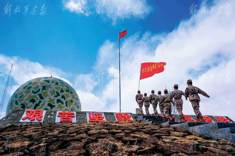 “甘巴拉英雄雷达站”官兵高擎旗帜走上阵地,开展系列仪式教育。(摄影/马 冰)