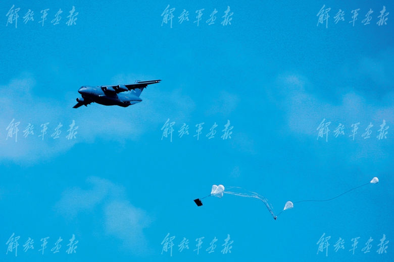 2021年8月,在“国际军事比赛-2021”中,我军新型运输机运-20参加“航空飞镖”项目赛,首次亮相国际赛场,实施重装空投。(摄影/邓晓明)