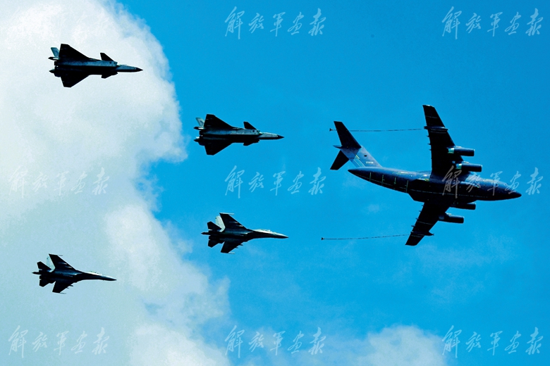2023年7月,空军航空开放活动·长春航空展上,运油-20与歼-20双机、歼-16双机进行空中加油编队通场展示。(摄影/记者 王 俊)