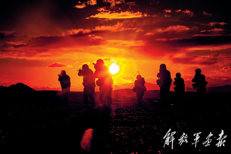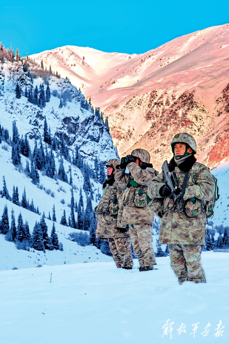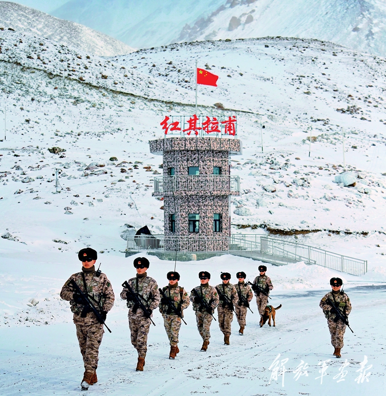西藏日喀则军分区某部官兵在冰峰雪谷间巡逻执勤。(摄影/王 乾)