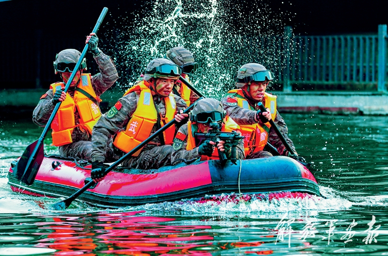 武警江苏总队徐州支队开展实战化训练,特战队员操舟过河。(摄影/张树彬)