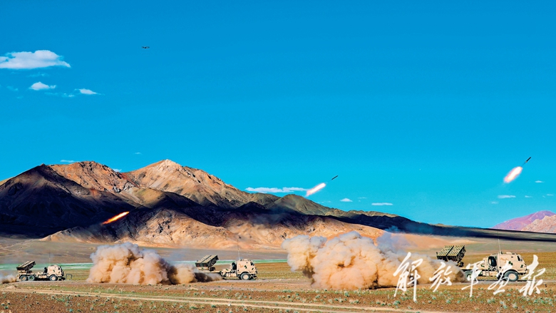 陆军某火力团开展实战化射击训练,对“敌”实施火力覆盖。(摄影/卢芝锐)