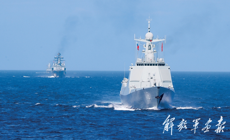 当地时间8月4日,中俄“海上联合-2025”联合演习中,中俄参演舰艇进行编队运动训练。(摄影/王 可)