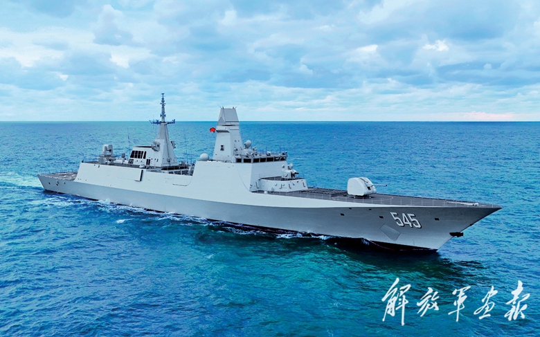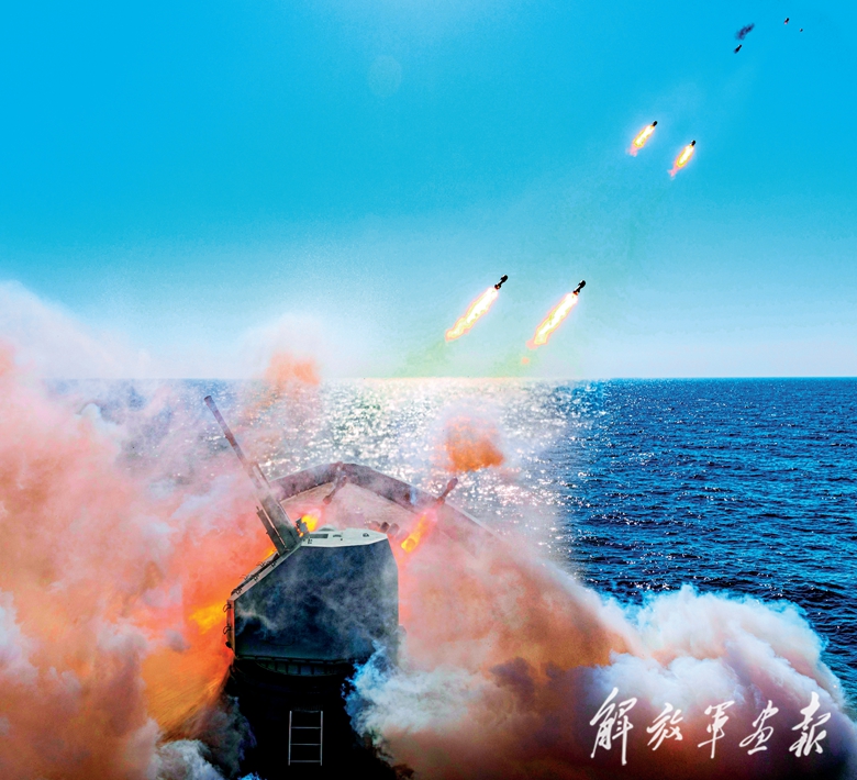 海军某驱逐舰支队邯郸舰在海上训练中,向目标海域发射火箭深弹。(摄影/马玉彬)