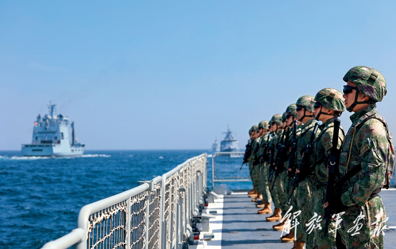 2月,我海军参加“和平-2025”多国海上联合演习。图为在国际阅舰式上,中方参演官兵在甲板上列队受阅。(摄影/任 科)