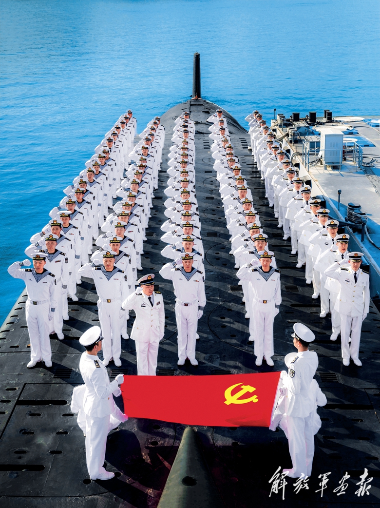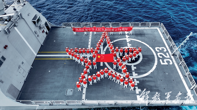 国庆前夕,在亚丁湾海域执行护航任务途中, 海军第47批护航编队为祖国献上祝福。(摄影/李 眺)
