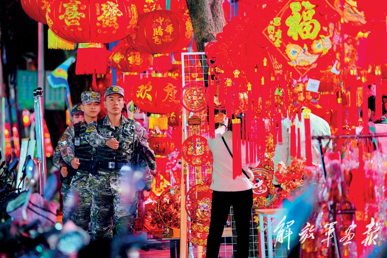 除夕,武警海南总队三亚支队官兵在三亚市第一农贸市场巡逻。(摄影/黄文涛)