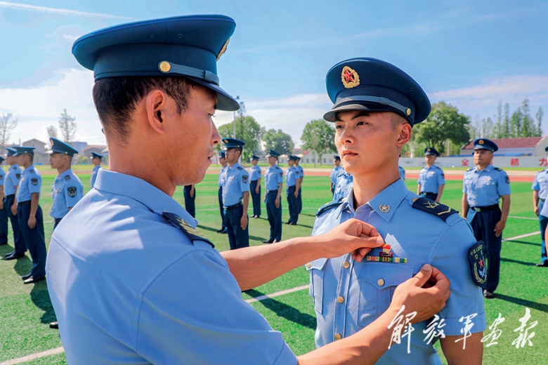 空军某部开展“传承红色基因、凝聚奋进力量”主题党日活动,党员骨干为新党员佩戴党员徽章。(摄影/朱海涛)