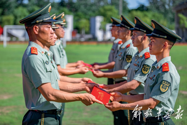 武警上海总队机动第二支队开展主题党日活动,为党员代表颁发政治生日贺卡。(摄影/余海洋)