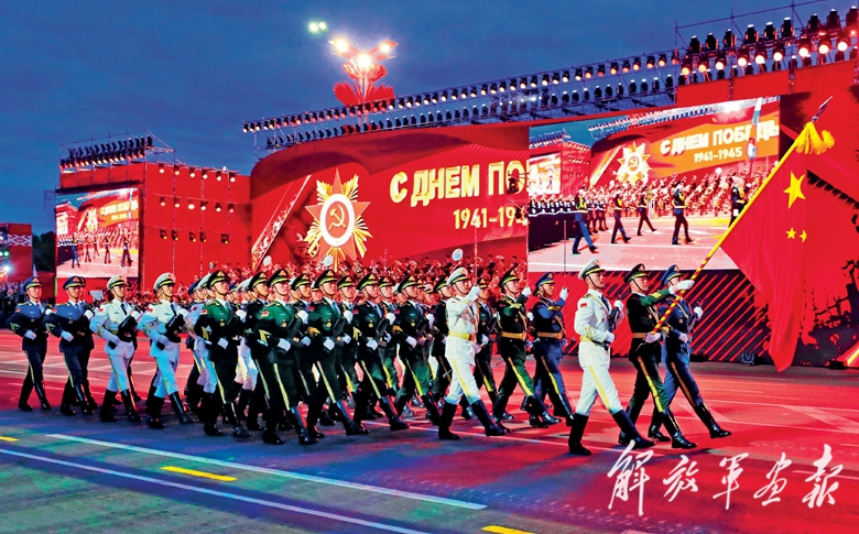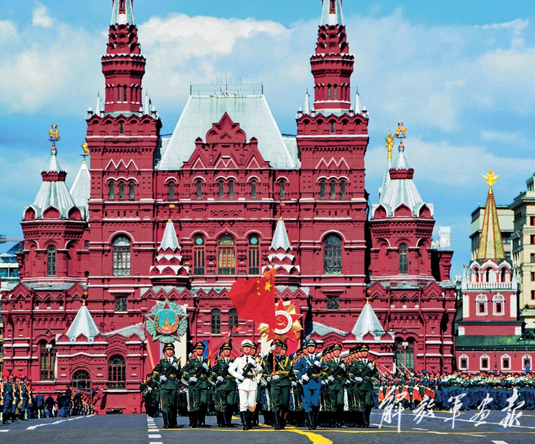 5月9日,在俄罗斯首都莫斯科,中国人民解放军三军仪仗队方队参加纪念苏联伟大卫国战争胜利80周年阅兵式,向世界展示中国军人的良好形象和时代风采。(摄影/新华社记者 赖向东)