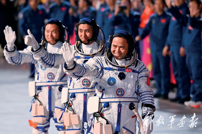 10月31日晚,神舟二十一号载人飞行任务航天员乘组出征仪式在酒泉卫星发射中心问天阁圆梦园广场举行。这是航天员张陆(右)、武飞(中)、张洪章在出征仪式上。(摄影/新华社记者 连 振)