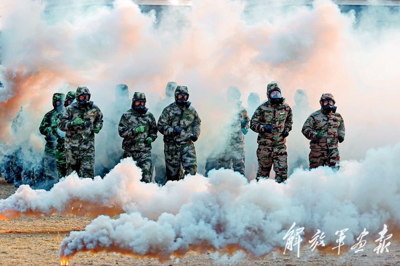 火箭军某旅某发射分队官兵开展穿越毒障训练。(摄影/陈 浩)