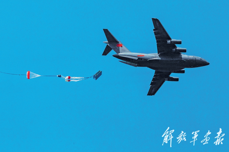 空军航空兵某师开展跨昼夜训练, 运-20飞机进行重装空投。(摄影/谭巳成)