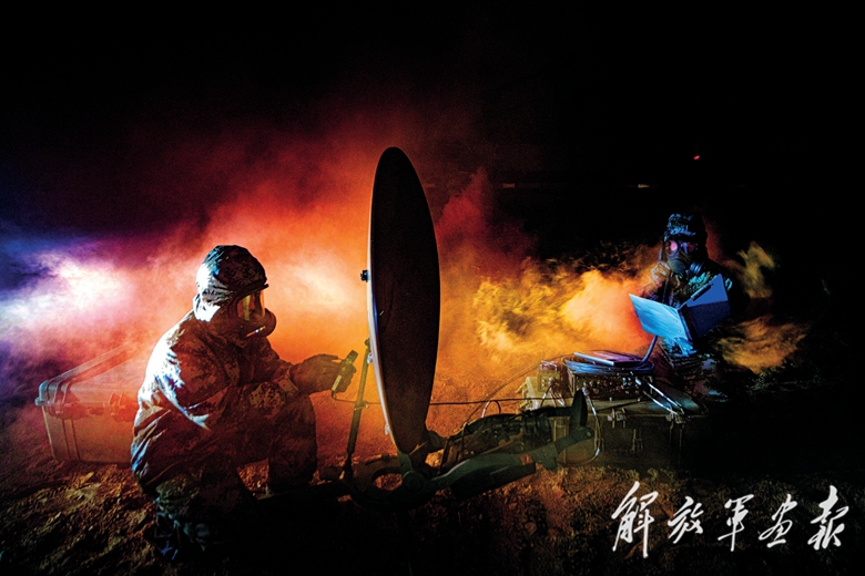 火箭军某部开展实兵对抗训练,面对通信受阻中断特情,官兵重新构建通信网络。(摄影/赵吉垒)