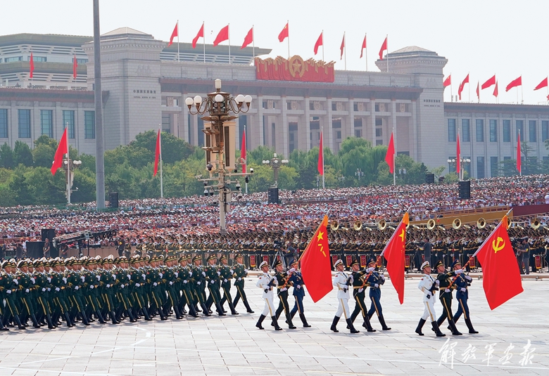 9月3日,纪念中国人民抗日战争暨世界反法西斯战争胜利80周年大会在北京天安门广场隆重举行,80面抗战英模部队荣誉旗帜组成的战旗方队,承载着历史荣光浩荡而来。(摄影/记者 宋 雯)
