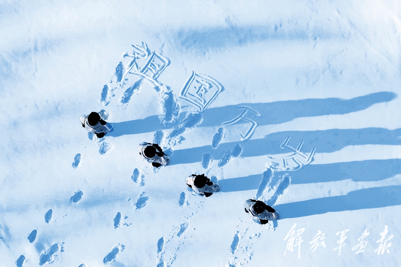 春节前夕,“南海第一哨”官兵代表赴北极哨所参加互学共建活动。图为两哨所官兵共同在雪地上写下“祖国万岁”。(摄影/孙卓文)