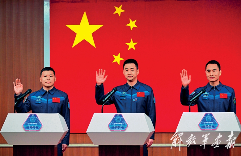 4月23日,神舟二十号载人飞行任务航天员陈冬(中)、陈中瑞 (右)、王杰在酒泉卫星发射中心问天阁与媒体记者集体见面。( 摄影/新华社记者 连 振)