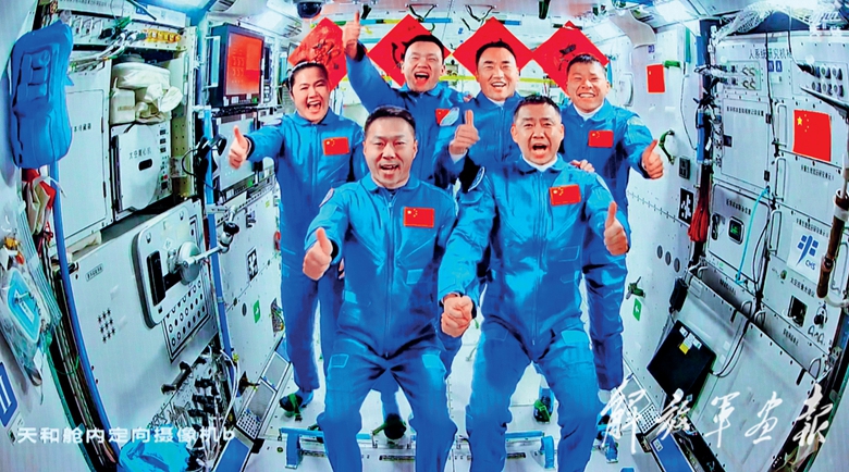 4月25日,在北京航天飞行控制中心拍摄的神舟二十号航天员乘组和神舟十九号航天员乘组“全家福”。(摄影/新华社记者 金立旺)