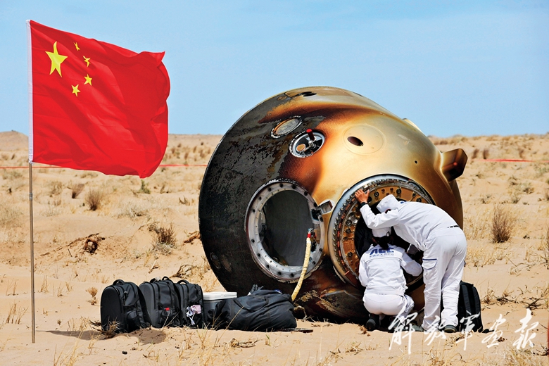 4月30日13时08分,神舟十九号载人飞船返回舱在东风着陆场成功着陆,现场医监医保人员确认航天员蔡旭哲、宋令东、王浩泽身体状态良好。(摄影/新华社记者 马金瑞)