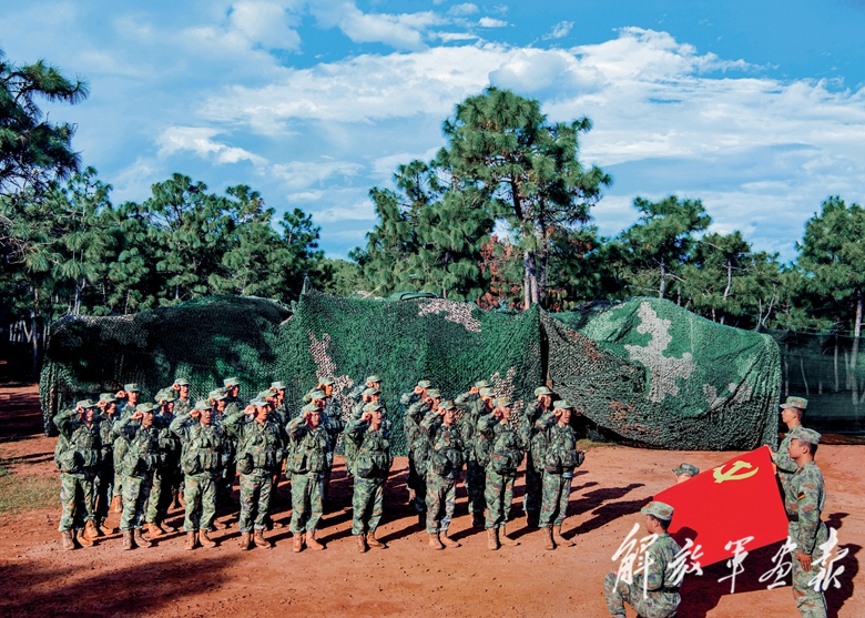 南部战区空军某旅雷达站老连长邓传友和老指导员李平坤回到军营忆战史、讲传统、话强军,鼓励官兵赓续好传统、传承好作风,为强军事业做出新的更大贡献。图为在两位老兵的见证下,雷达站党员重温入党誓词。(摄影/李彦晓)