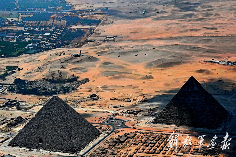 5月初,中埃“文明之鹰-2025”空军联合训练中,中埃双方战机超低空编队飞越埃及金字塔。这是中国空军首次出动体系力量赴非洲开展联合训练。(摄影/余红春)