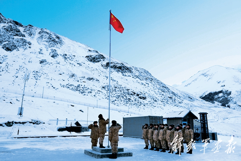 新疆军区某边防团河源边防连官兵举行升国旗仪式。(摄影/记者 王雁翔)