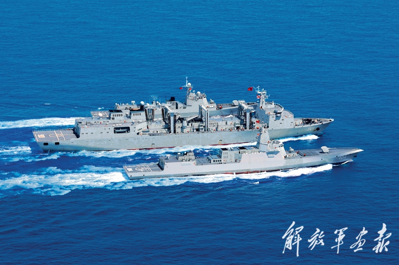 海军辽宁舰、山东舰航母编队赴西太平洋等海域开展训练,检验部队远海防卫和联合作战能力。图为训练中,航母编队属舰进行航行补给。(摄影/景 钢)