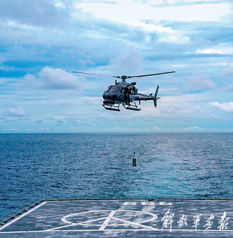 10月21日,中国和马来西亚“和平友谊-2025”联合演习中,马方直升机与中方井冈山舰开展垂直补给训练。(摄影/王 磊)