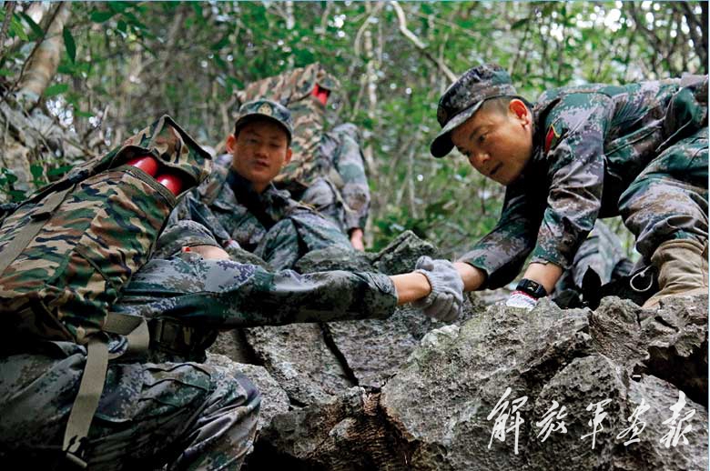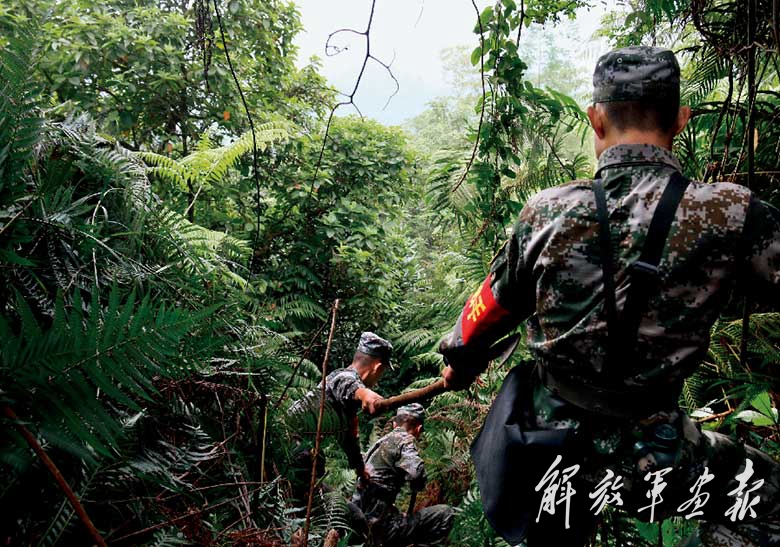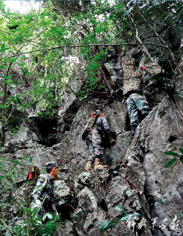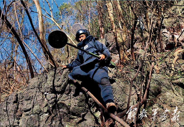 雷场作业任务的第一步,是勘察雷场。扫雷官兵带着地图、北斗手持机和砍刀走入密林,在勘察雷场的同时,为进出雷场开辟出一条人工通道。南方喀斯特地貌造就了雷区的复杂地理环境,便于行走的平地往往埋有地雷。为避开雷区,官兵们有时不得不选择从悬崖峭壁上攀爬,就连搬运爆破筒也要走这样的路,当地老百姓都把扫雷官兵称为“雷场‘攀岩人’”。