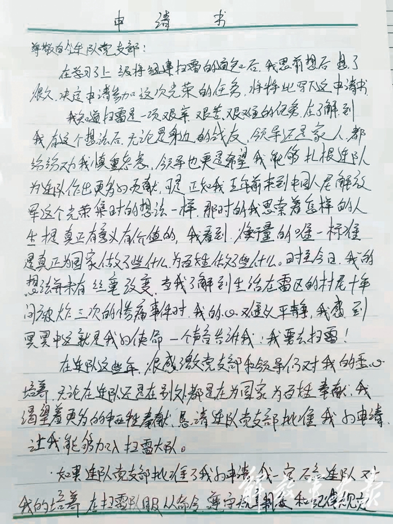 答案,写在他的请战书上。2015年6月,当云南边境第三次大面积扫雷任务下达时,他立即报名。在给连队党支部递交的请战书上,他这样写道:“加入解放军这个光荣集体,我思索着怎样的人生才是真正有意义有价值的。衡量的唯一标准,是真正为国家做了些什么,为百姓做了些什么……我感到,冥冥之中,这就是我的使命。”